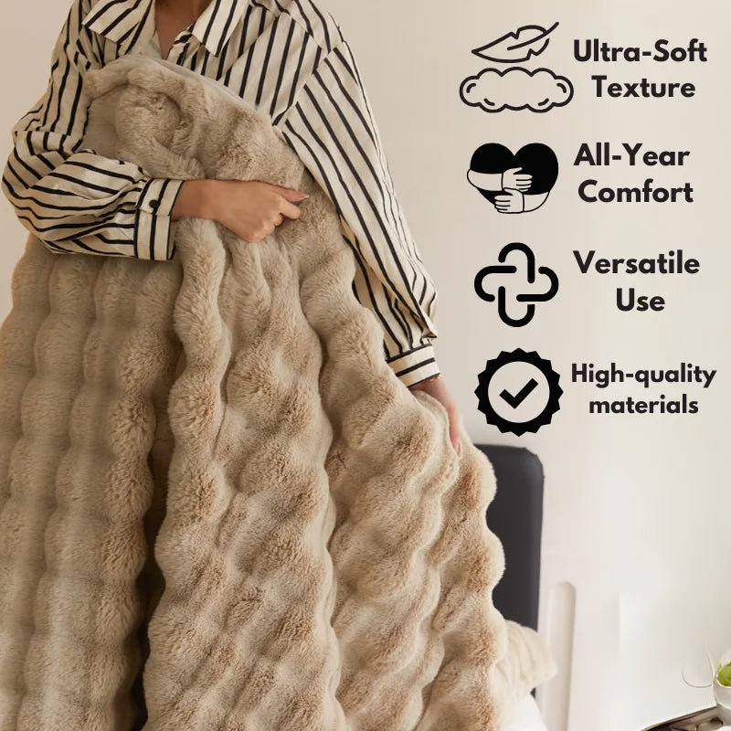 The blanket is made from high-quality faux rabbit fur, known for its softness and durability.